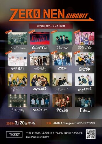 3月20日(木・祝)に心斎橋に新しいサーキットイベント「ZERO NEN CIRCUIT」が誕生する。東京・下北沢MOSAiCと大阪・関大前TH-R HALLの東西のライブハウススタッフが主催となり、2024年5月から数回行った単独イベントを経て、今回初の4会場サーキットフェスと…