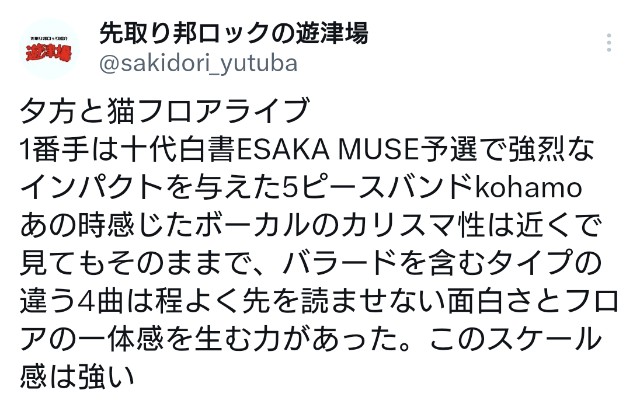 そこを乗り越えて、間違いなく熱い関西シーンの中心に今いるし、まだまだ上を目指す夕方と猫。ここから大期待です。