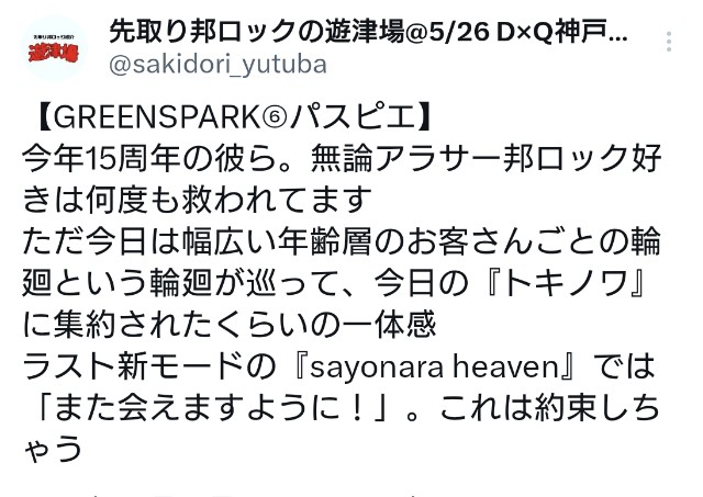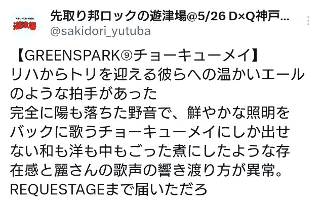 曇天だし、時間も遅くなってきたし、なのにローラズの周りだけは鮮やかな新緑が見えたのが、なんなら一番の「GREEN SPARK」だったかもしれない。マジで横揺れしてたら、いつの間にか終わってた。